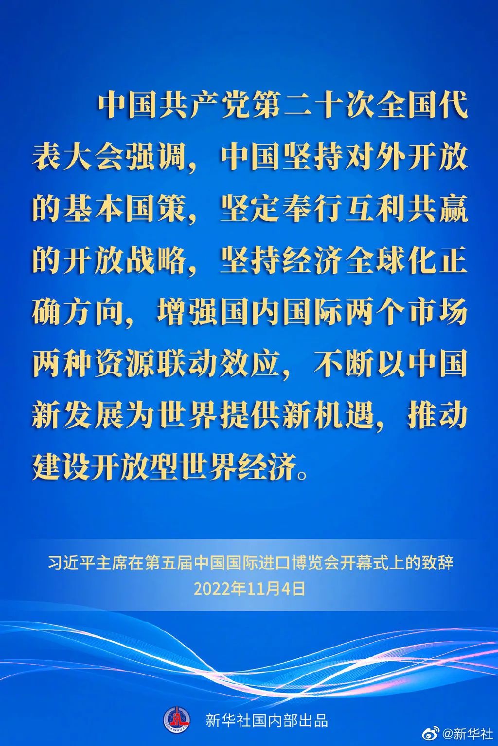習(xí)近平指出,中國共產(chǎn)黨第二十次全國代表大會強(qiáng)調(diào),中國堅(jiān)持對外開放的基本國策,堅(jiān)定奉行互利共贏的開放戰(zhàn)略,堅(jiān)持經(jīng)濟(jì)全球化正確方向,增強(qiáng)國內(nèi)國際兩個(gè)市場兩種資源聯(lián)動(dòng)效應(yīng),不斷以中國新發(fā)展為世界提供新機(jī)遇,推動(dòng)建設(shè)開放型世界經(jīng)濟(jì)。