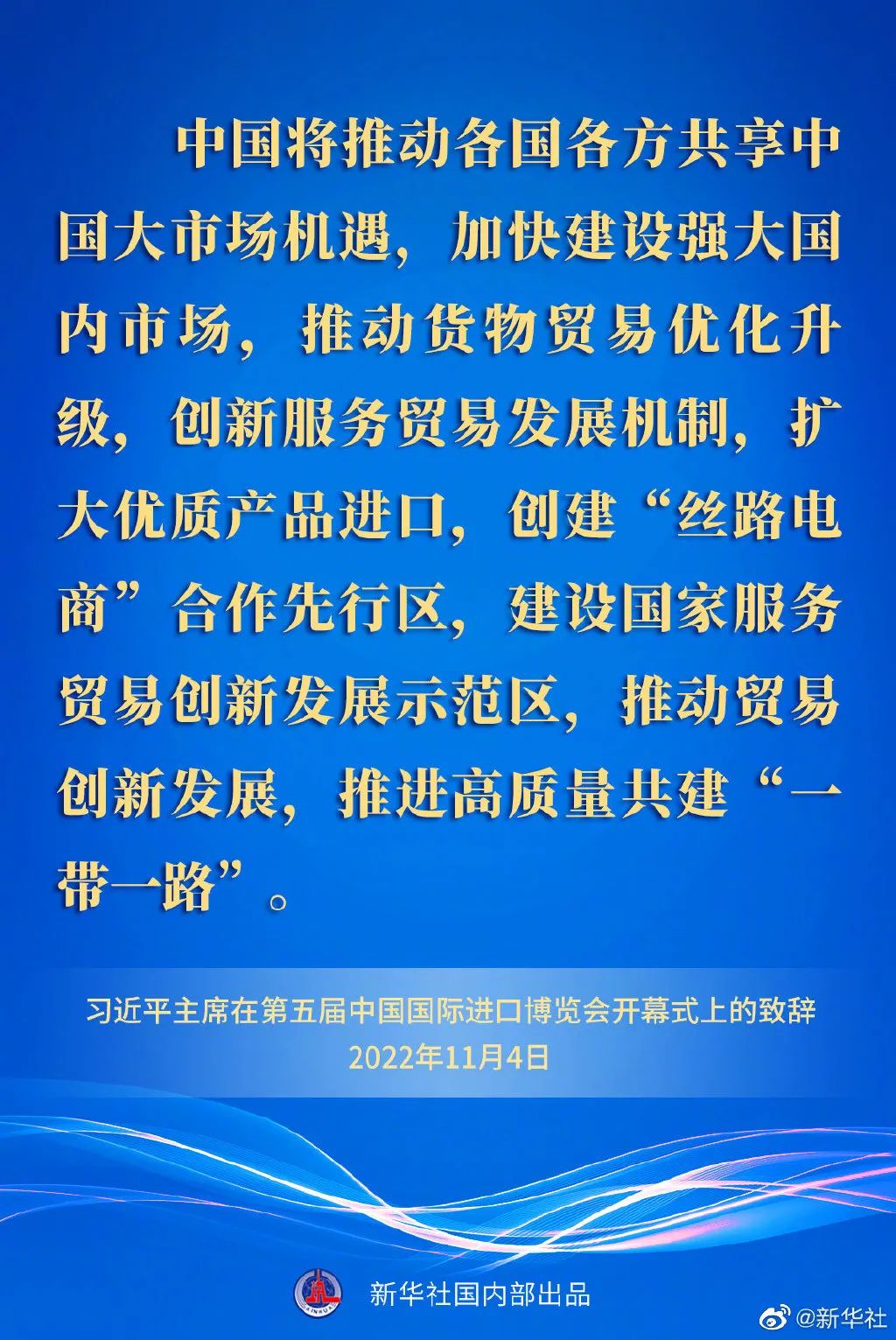 ——中國將推動(dòng)各國各方共享中國大市場機(jī)遇,加快建設(shè)強(qiáng)大國內(nèi)市場,推動(dòng)貨物貿(mào)易優(yōu)化升級,創(chuàng)新服務(wù)貿(mào)易發(fā)展機(jī)制,擴(kuò)大優(yōu)質(zhì)產(chǎn)品進(jìn)口,創(chuàng)建“絲路電商”合作先行區(qū),建設(shè)國家服務(wù)貿(mào)易創(chuàng)新發(fā)展示范區(qū),推動(dòng)貿(mào)易創(chuàng)新發(fā)展,推進(jìn)高質(zhì)量共建“一帶一路”。