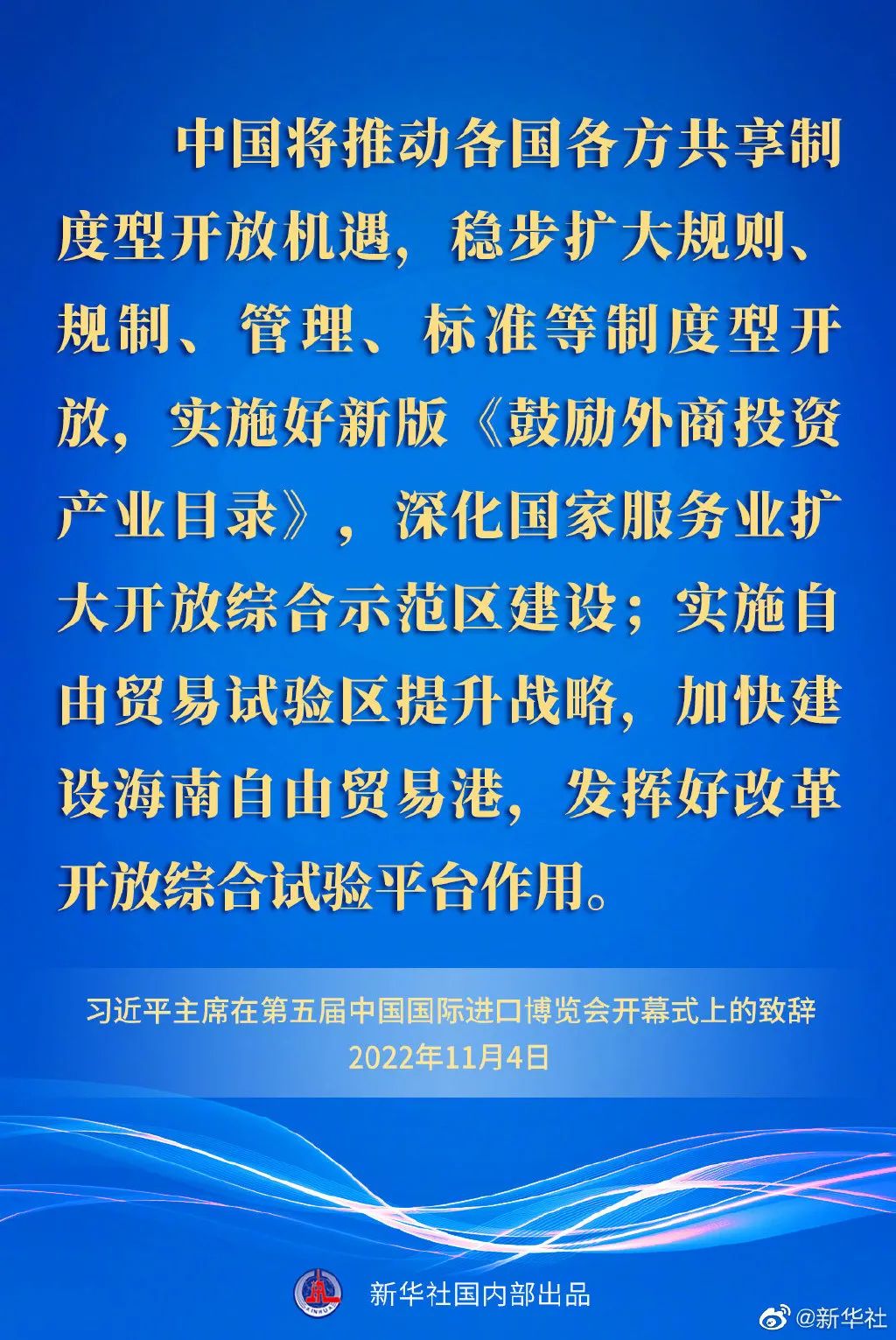 ——中國將推動(dòng)各國各方共享制度型開放機(jī)遇,穩(wěn)步擴(kuò)大規(guī)則、規(guī)制、管理、標(biāo)準(zhǔn)等制度型開放,實(shí)施好新版《鼓勵(lì)外商投資產(chǎn)業(yè)目錄》,深化國家服務(wù)業(yè)擴(kuò)大開放綜合示范區(qū)建設(shè);實(shí)施自由貿(mào)易試驗(yàn)區(qū)提升戰(zhàn)略,加快建設(shè)海南自由貿(mào)易港,發(fā)揮好改革開放綜合試驗(yàn)平臺作用。