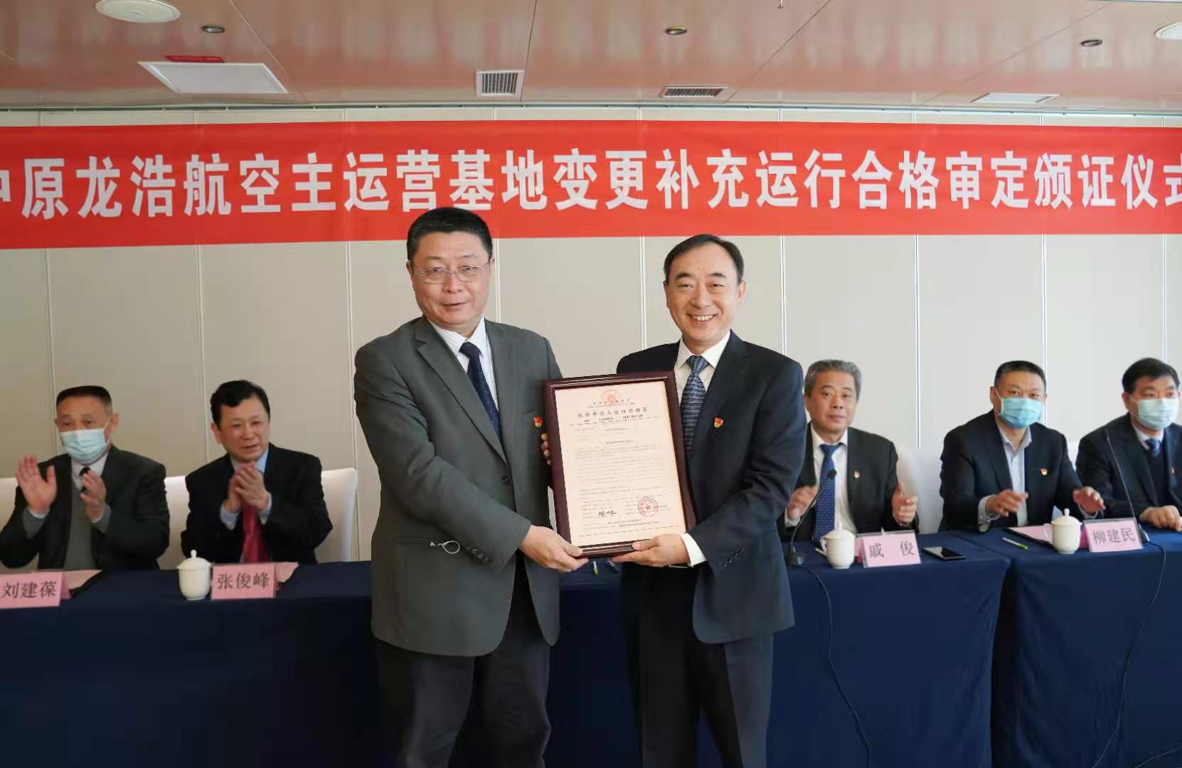 3月4日上午,民航中南地區(qū)管理局局長馬兵在鄭州向中原龍浩航空有限公司頒發(fā)了《航空承運(yùn)人運(yùn)行合格證》,這標(biāo)志著中原龍浩的主運(yùn)營基地由廣州變更至鄭州新鄭國際機(jī)場,進(jìn)入了鄭州廣州“雙基地”協(xié)同聯(lián)動(dòng)、充分運(yùn)營的新階段。河南省財(cái)政廳黨組成員、副廳長趙慶業(yè)與馬兵共同參加頒證儀式并致辭,民航河南監(jiān)督管理局局長戚俊主持儀式。頒證結(jié)束后,馬兵等參觀了中原龍浩AOC運(yùn)行控制大廳。