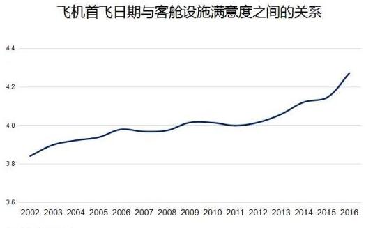 上圖是飛機首飛日期與客艙設施滿意度之間的關系,可以看出首飛日期越近滿意度越高,首飛日期越早滿意度越低,而且是持續(xù)地降低?!耙簿褪钦f我們人的需求在變化,我們得跟上人的需求變化。行業(yè)的標準是持續(xù)的在升級的,我們需要往前追趕?!?